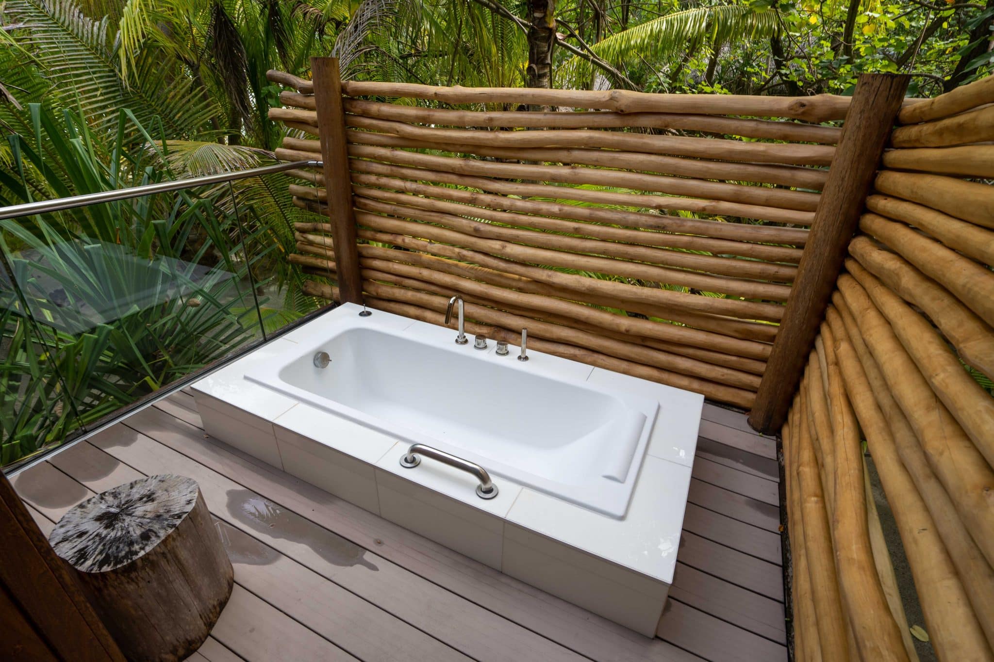 The villas also showcase an outdoor bathtub, nestled amidst the aromatic tropical garden. Here, you can soak in warm air and the gentle rustle of palm leaves, or relax under the vast, starlit sky at night while bathing in the soft glow of the moon.