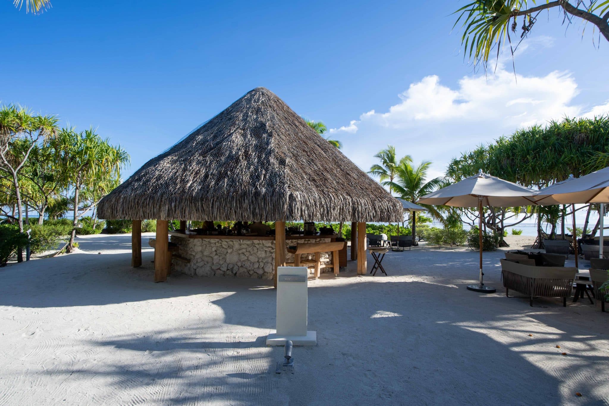 The villas are sprinkled along the eastern and western beachfronts, offering panoramic views of the shimmering ocean waves and beachfront, while the hubs of activity take place at the public areas and shared facilities nestled at the islet’s base. The Resort Centre is the heart of the resort, where you’ll find the front desk, restaurants, beach and pool area, activities, a couple shops, and the bar. If you head a bit more inland, towards the northeast, you’ll discover the spa and fitness facilities, as well as pathways that lead to stunning views and offer convenient access to the airport runway and secluded beaches alike.