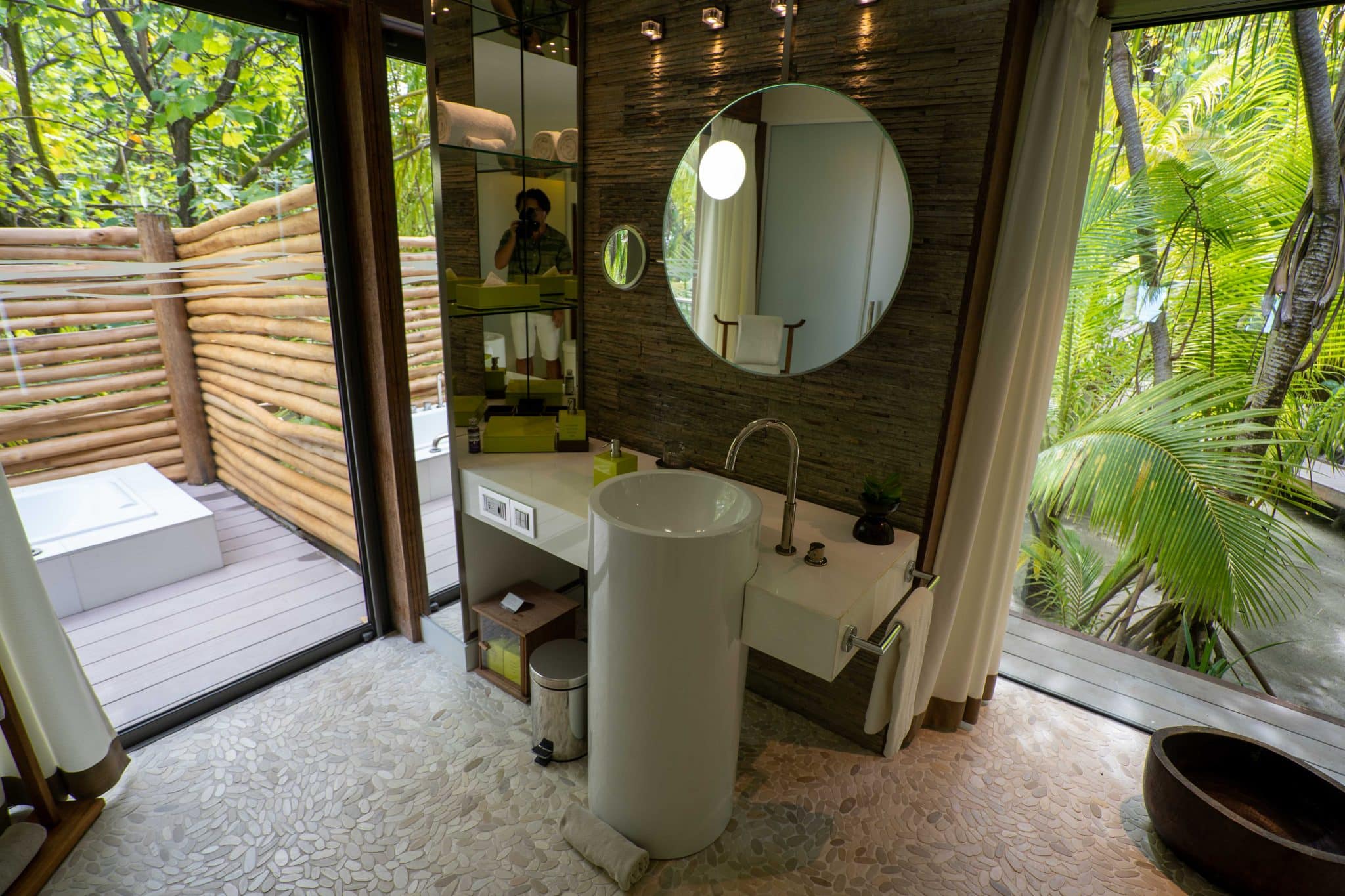 The resort itself unfolds in two distinctive parts: the lower enclave, home to the luxurious resort, and the elevated section, hosting the airstrip and secluded staff village. A winding pathway encircles the main islet, guiding you through the resort’s awe-inspiring grounds, stunning public spaces, and ingeniously concealed villas. For effortless navigation through this slice of heaven, each guest is provided a bicycle; however, for those seeking leisure or simply preferring a laid-back journey, electric carts, steered by staff, stand ready to whisk you to your desired location.