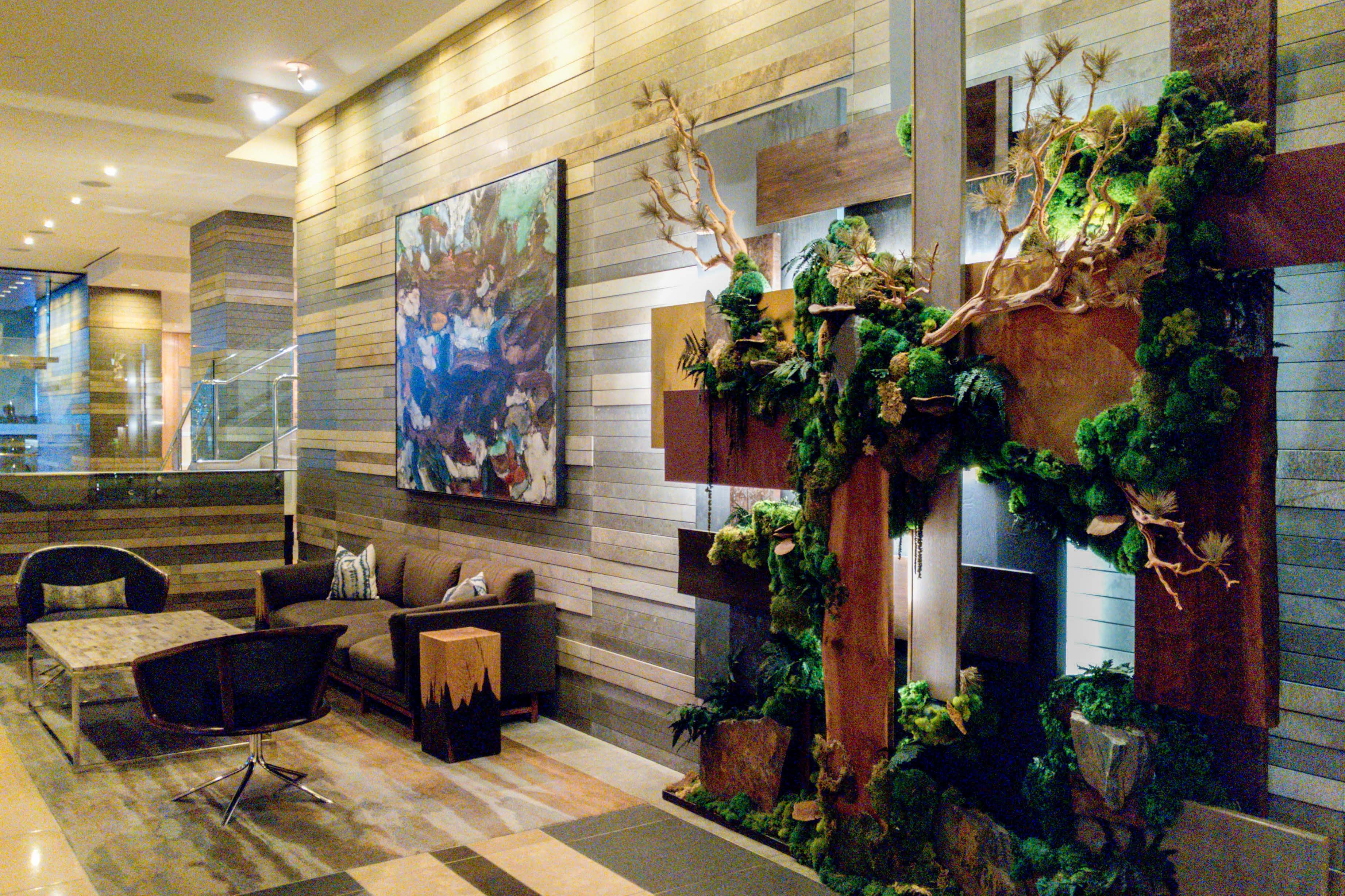 You’ll be welcomed to the hotel by the valet staff, who are also valuable resources for queries about where to go in the city and how to get there. Inside, the lobby lounge emits warmth with its multiple fireplaces, perfect for coming back in from a walk in the drizzle. Natural elements in the seating area and on the walls highlight the hotel’s home in the Pacific Northwest. As you make your way from the check-in area to the elevators, keep an eye out for complimentary baked goods and a warm beverage on offer by the Concierge desk.